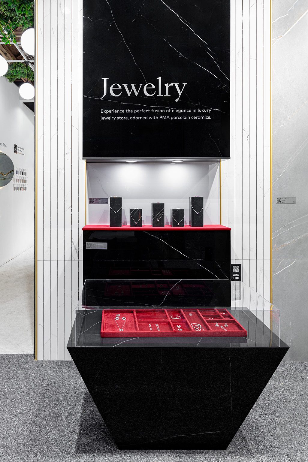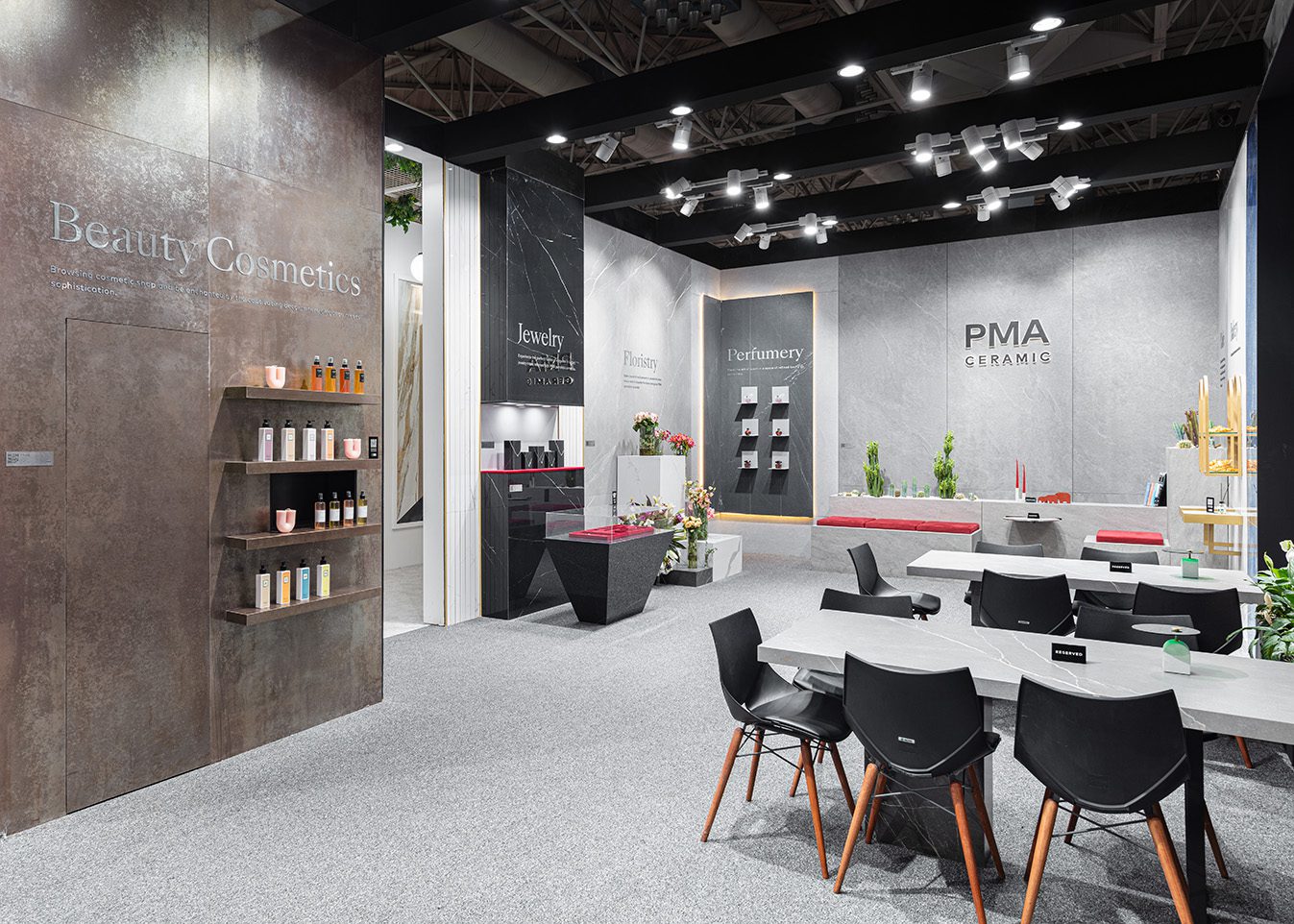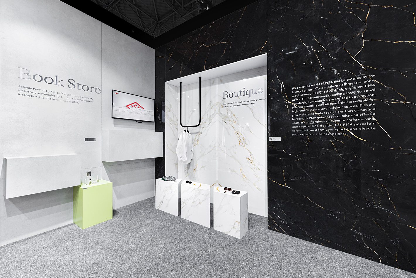 بازدیدکنندگان در ابتدای ورود، برشی از فضاهای تجاری لاکچری مانند بوتیک، جواهر فروشی، بوک استور، کافه و .... را مشاهده میکردند که پتانسل سرامیکهای پما در کاربری کامرشیال شامل مراکز تجاری، مراکز اداری، بیمارستانها و غیره را به خوبی به نمایش میگذاشت. در این بخش لعاب جدید اکساید و پانچ جدید محصول لیون اسلیت توجهها را جلب میکرد.