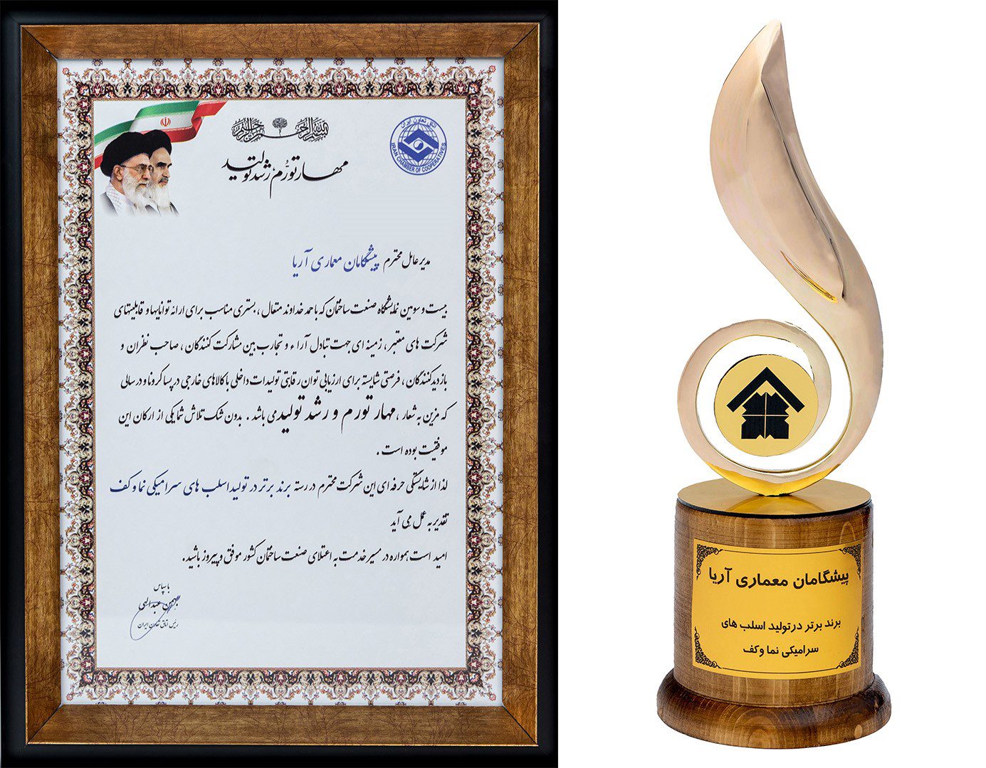 در همین راستا، پیشگامان معماری آریا از جانب رئیس اتاق تعاون ایران گواهینامه و تندیس برند برتر در تولید اسلبهای سرامیکی نما و کف را دریافت کرد.